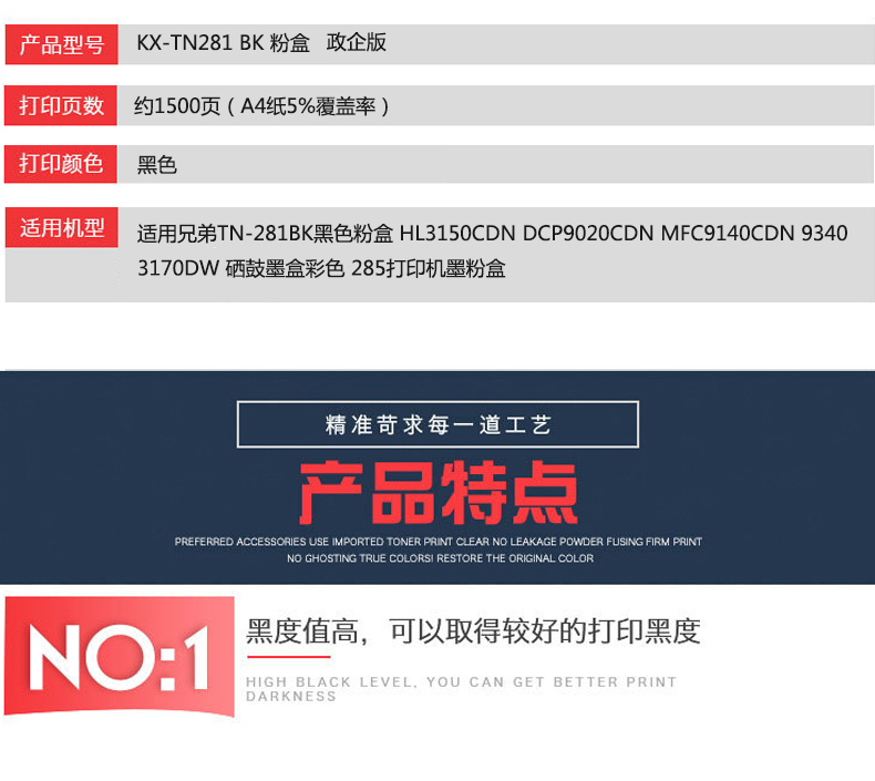 凱欣KX-TN281BK 適用兄弟TN-281BK黑色粉盒 HL3150CDN DCP9020CDN MFC9140CDN 硒鼓墨盒彩色 全國(guó)統(tǒng)一價(jià):268元