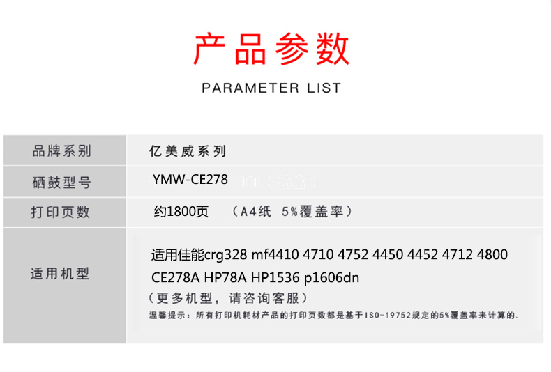 億美威 YMW-CE278 惠普 LaserJet Pro P1566/1606/1536 全國統(tǒng)一價:178元